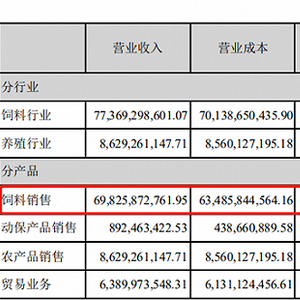 在上述背景下,海大集团的饲料销售业务景气度较高,全年实现营收698.26亿元,同比增长43.19%。不过该业务毛利率却同比下滑1.24%至9.08%。