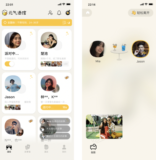 不同于市场上众多以IM(Instant Messaging)功能为主的交友软件,元气酒馆通过“实时语音”与“投影故事”构建了一种跨越时空的“在线约会”方式,不仅还原了线下见面的真实感,而且还避免了诸多线下见面的烦恼。