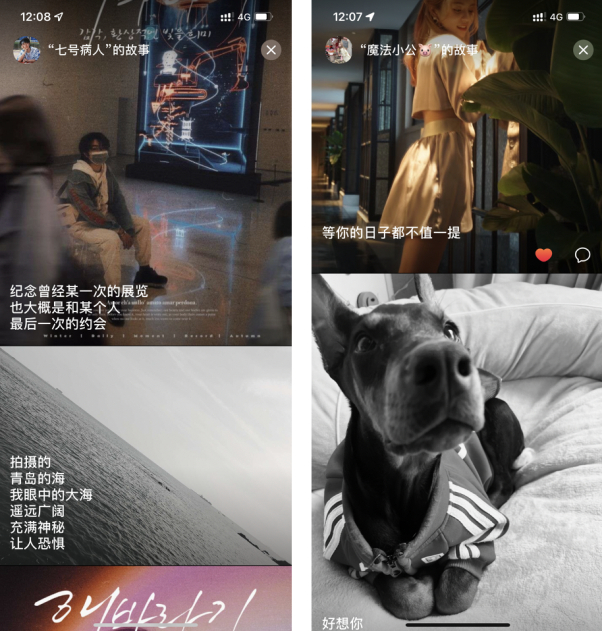 对方同意后,双方将进入双人语音房间。而后,画面会显示两人的基本信息及头像,说话时头像会亮起,左下角可选的交互为“投影故事”,双方都可以浏览对方上传的人生故事,可能是爱好、特别的经历或是欣赏的景色,以此为契机展开谈话。