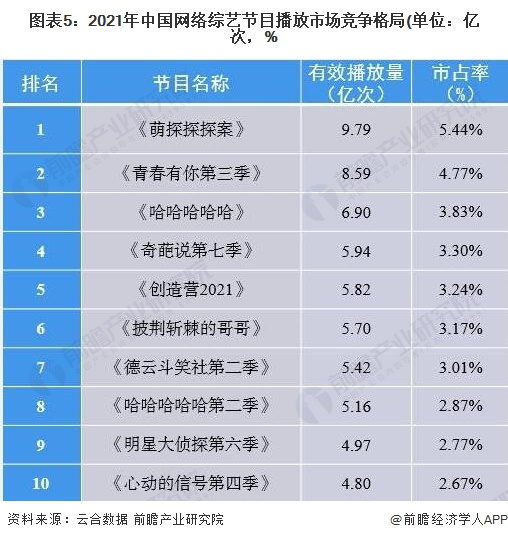 据云合数据统计显示,2021年,我国全网网络综艺有效播放前十中有7档综艺节目是综N代,由此可见,综N代网络综艺节目在我国仍是最受欢迎的类型。具体来看,《萌探探探案》以9.79亿的播放量排名第一,占总播放量的5.44%;《青春有你第三季》和《哈哈哈哈哈》分列二三位,市占率分别为4.77%和3.83%。