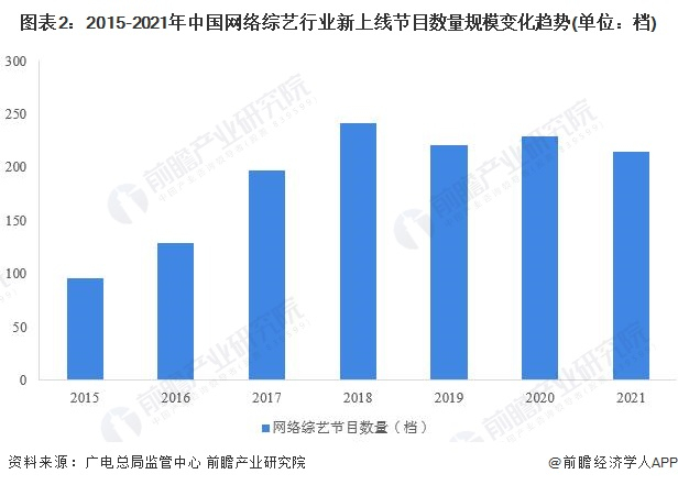 据广电总局监管中心统计数据显示,2015-2018年,我国网络综艺节目数量规模快速增长,到2018年,全国新上线网络综艺节目241档,为近年最高。2019年以来,随着我国网络综艺市场发展趋势平稳,叠加疫情影响,全国新上线网络综艺节目数量规模有所回落,到2021年,据艺恩数据统计,全国新上线网络综艺节目215档。