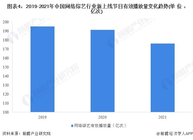 从网络综艺节目播放量来看,据云合数据统计显示,2019年以来,我国网络综艺节目总体有效播放量呈现小幅下滑的发展趋势,2019年,全国新上线网络综艺节目有效播放量总计195亿次,到2021年,全国新上线网络综艺节目有效播放量总计176亿次,同比下滑7.8%。