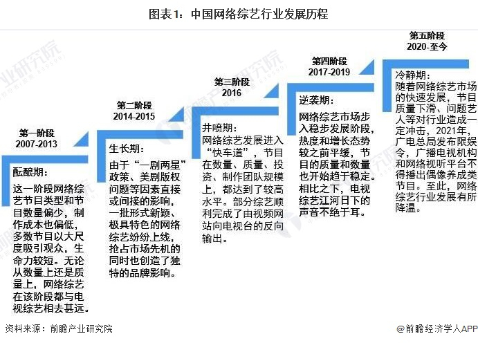 2007年,脱口秀节目《大鹏嘚吧嘚》在搜狐视频上线,首次将大众的视线聚焦到网络综艺这个新兴领域,网络综艺行业的大幕徐徐拉开。整体来看,我国网络综艺行业的发展主要经历了以下几个阶段:
