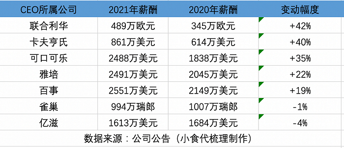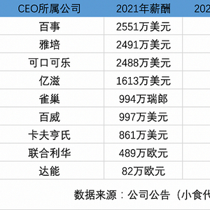 从最新榜单来看,继2020年“普降”后,大部分CEO的薪酬在后疫情时代已重新上涨,且加薪几乎都达到“千万级别”。这在某种程度上也展现了作为民生刚需的食品饮料自带韧性。