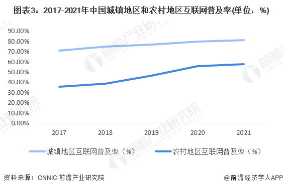 具体看不同地区的普及率,截至2021年12月,我国城镇地区互联网普及率为81.3%,较2020年12月提升1.5个百分点;农村地区互联网普及率为57.6%,较2020年12月提升1.7个百分点。城乡地区互联网普及率差异较2020年12月缩小0.2个百分点。