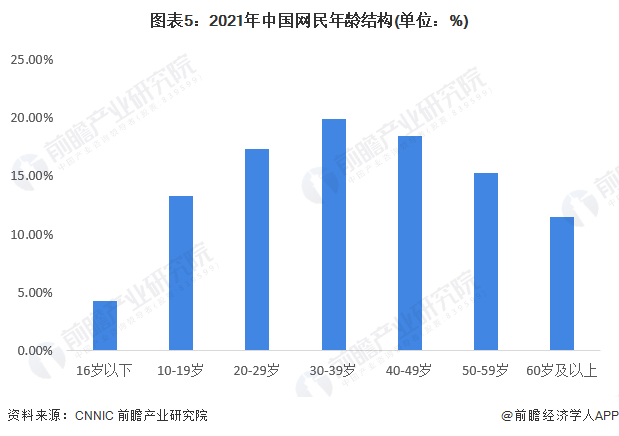从年龄结构来看,截至2021年12月,20-29岁、30-39岁、40-49岁网民占比分别为17.3%、19.9%和18.4%,高于其他年龄段群体;50岁及以上网民群体占比由2020年12月的26.3%提升至26.8%,互联网进一步向中老年群体渗透。