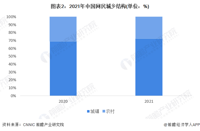 从中国网民城乡结构来看,截至2021年12月,我国农村网民规模为2.84亿,占网民整体的27.6%;城镇网民规模为7.48亿,较2020年12月增长6804万,占网民整体的72.4%。