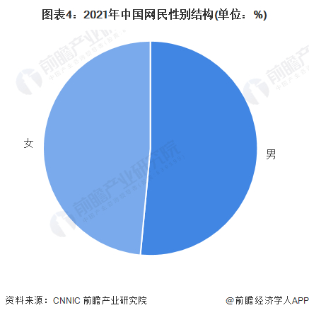 从中国网民性别结构来看,截至2021年12月,我国网民男女比例为51.5:48.5,与整体人口中男女比例基本一致。
