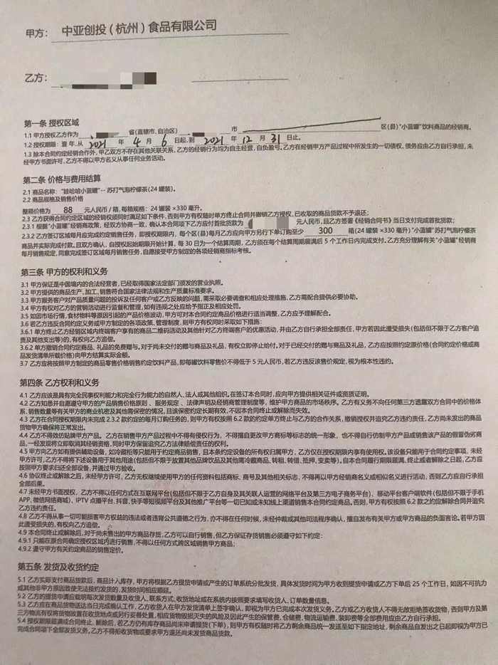 另外,让林亚觉得不可思议的是,已交货款所对应的货还未发完,中亚创投却以经销合同里约定“经销商每月至少下单300箱任务量”这一条款向他催款。