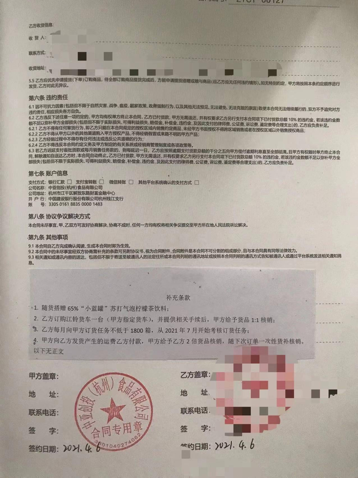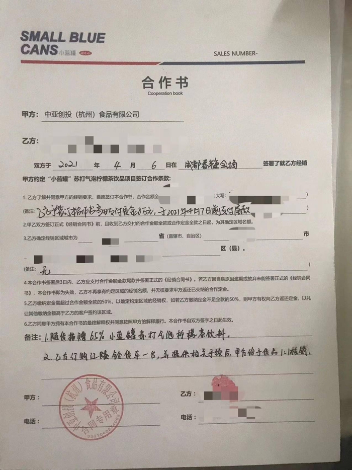 在2021年成都糖酒会上,四川人钟明同样被“娃哈哈”醒目的logo吸引。为了证实产品的真实性,钟明还当场打通了娃哈哈客服的电话。“当时对方说小蓝罐是他们红安工厂生产的,不是贴牌的,中亚创投又说他们是娃哈哈的子公司,所以我很放心。”钟明现场签下意向合同书,并支付了1万元定金。