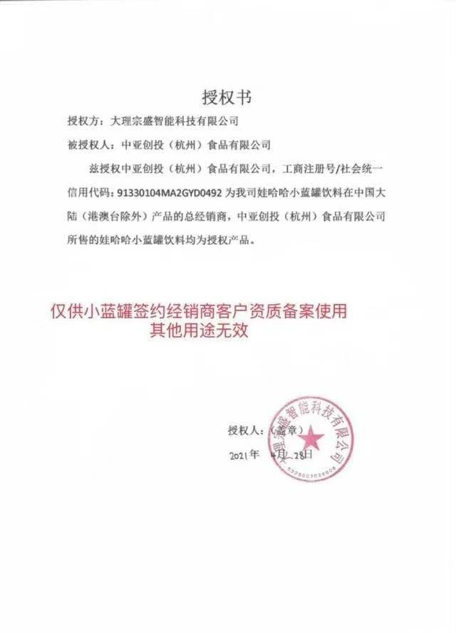 而中亚创投为大理宗盛授权的娃哈哈小蓝罐在中国大陆的总经销商。经销商提供给时代财经的授权书有两份,签订日期分别为2020年1月1日和2021年4月28日,均无标注授权有效期。