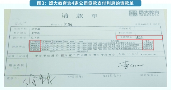 证据二:4家公司在济南农商行的贷款利息实由颂大教育承担。证券时报记者获得的颂大教育内部请款单、泰达鑫晨公司账户流水显示,颂大教育曾为4家公司的贷款按月支付利息(图3)。