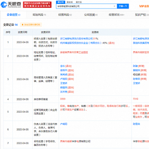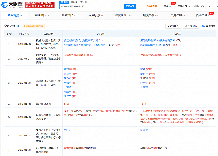 天眼查App显示,4月8日,原界首市南都华宇电源有限公司发生多项工商变更,企业名称变更为华宇新能源科技有限公司;原股东杭州博涵股权投资合伙企业(有限合伙)退出,新增雅迪科技集团有限公司为股东并持股70%;同时公司经营范围新增石墨及碳素制品制造;电子元器件与机电组件设备制造等。