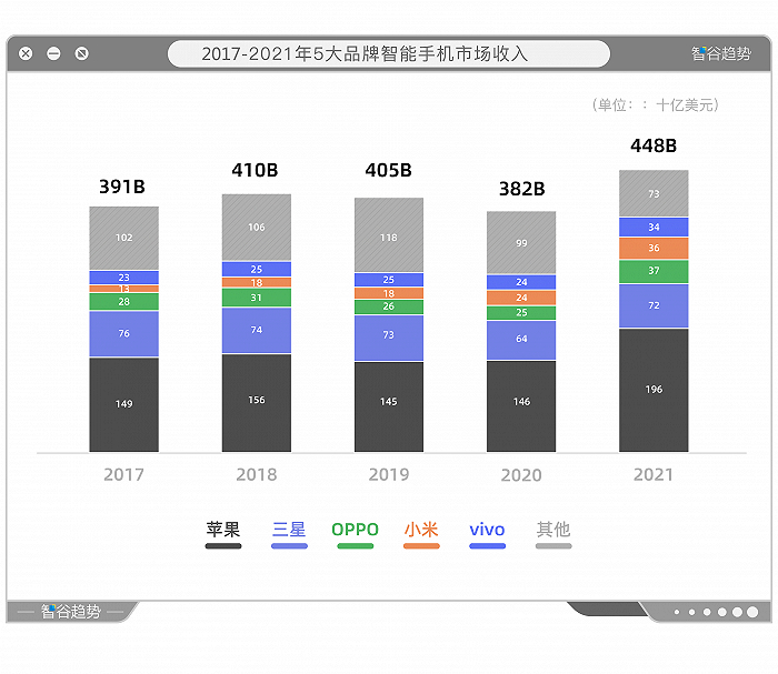 2021年,苹果在高端手机市场的份额猛然扩大。