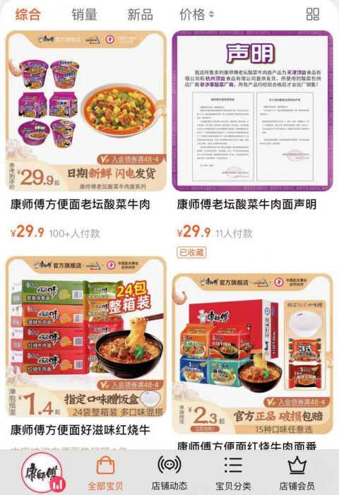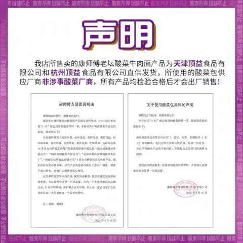 除了线下渠道,在电商平台的康师傅官方旗舰店,老坛酸菜牛肉面也恢复了销售。店铺首页也附上了“产品符合国家相关标准”的文件说明。