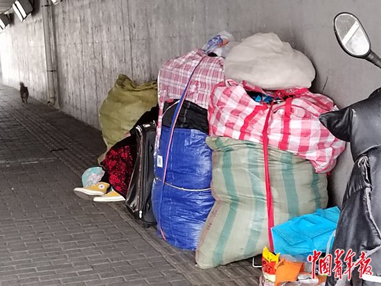 六里桥的桥洞下,堆放着一些编织袋,一位女性农民工坐在中间休息,被挡住了脸。