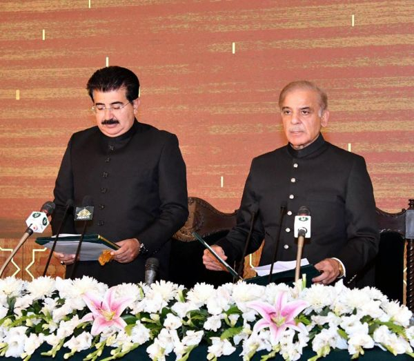 4月11日,夏巴兹·谢里夫(右)在伊斯兰堡宣誓就任巴基斯坦新一任总理。 新华社发(巴基斯坦媒体信息部供图)