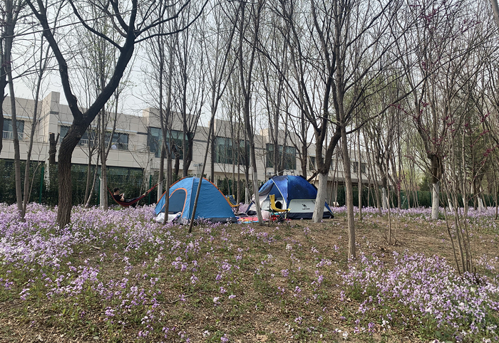在一些公园的露营区,很少见到便利店、自动售货机等配套设施。能过夜的大运河森林公园野营地,是很多露营爱好者的首选。清明假期的前一天,刘女士下午3点多就已经在平台上搭好了帐篷,就等着老公去学校接孩子回来,他们一家三口就可以在这里度过小长假了。三天的吃喝都要在这里解决,为此刘女士一家做了充足的准备。“卫生间就在附近,洗手洗脸基本没问题,喝的水我们也提前买好了。”刘女士遗憾地说,如果公园里能增设小超市或自动售货机就更好了,“孩子嘴馋了,就地就可以买些零食或饮料,就不用开车再出去找了。”