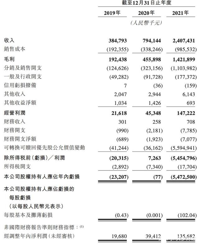 招股书显示,蕉下2019年、2020年和2021年的营收分别为3.85亿元、7.94亿元和24.07亿元;该公司股权持有人应占年内亏损(净亏损)分别为2320.7万元、7.7万元和54.73亿元,亏损规模飙升。