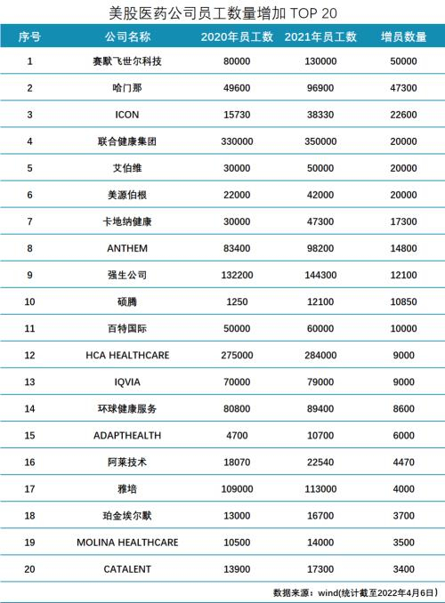 新冠疫情持续在全球蔓延,和新冠疫情直接相关的医药公司生意最红火,著名的IVD及CXO跨国大厂赛默飞世尔科技,2021年在全球净增5万员工,摘得增员榜榜首位置。
