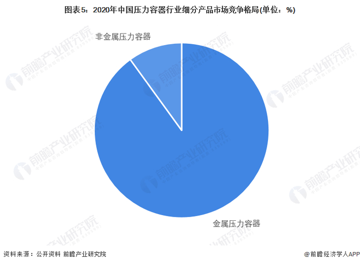 2020年,中国压力容器行业中,金属压力容器产品在市面上独当一面,绝大部分的压力容器市场均由金属压力容器产品贡献,金属压力容器领域目前具有较大的竞争优势,但未来,以新材料为基础的非金属容器或将成为压力容器市场主导。