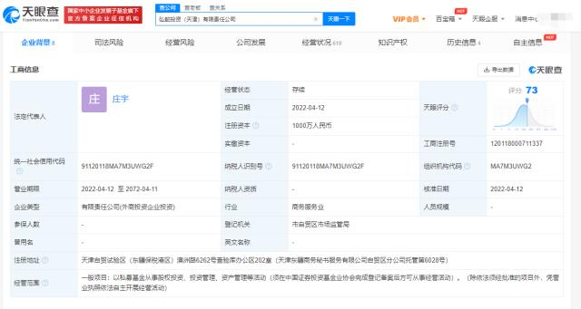 天眼查APP显示,近日,弘懿投资(天津)有限责任公司成立,法定代表人为庄宇,注册资本1000万人民币,经营范围包括以私募基金从事股权投资、投资管理、资产管理等活动。股东信息显示,该公司由天津国富新联管理咨询合伙企业(有限合伙)、富士康工业互联网股份有限公司分别持股51%、49%。