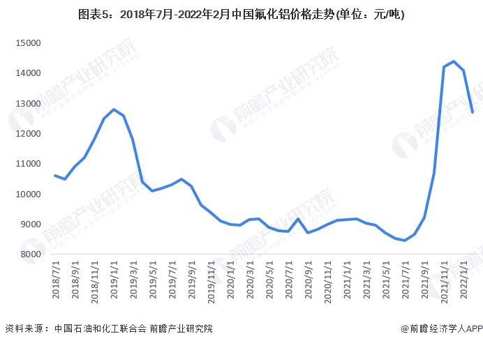 从价格走势来看,由于近两年国家对氟化铝,清库存,去产能的政策以及疫情的原因,氟化铝价格一直保持低迷,进入2021年更是进一步下降,但从下半年起,随着库存的逐渐减少,以及疫情后需求的逐渐恢复,氟化铝价格开始触底反弹逐渐回暖,2021年底,氟化铝价格达到14400元每吨,达近年来最高价格。截止2021年2月,我国氟化铝价格有所回落约12700元每吨,虽较高位有所回落,但仍处于历史较高水平。