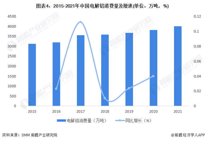 2015-2019年,我国电解铝消费量总体呈增长趋势。2019年,尽管电解铝消费量增速有所下滑,但较2018年仍增长了2.4%,消费量达到了3672万吨。2020年国内电解铝消费3818.8万吨,同比2019年增加4%。经过初步测算,2021年中国电解铝消费量达到4010万吨。