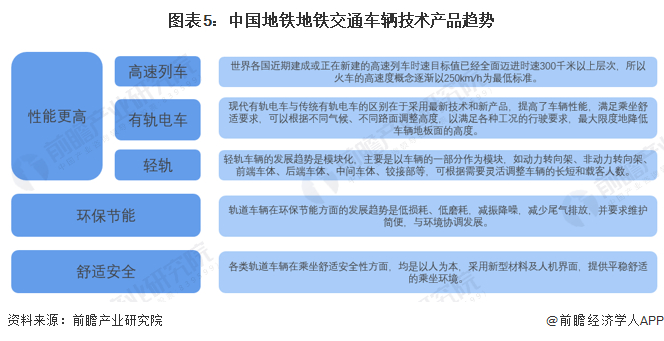 我国地铁交通车辆技术产品趋势为性能更高、节能环保以及舒适安全。从性能更高的角度,高速列车提速为主要趋势,有轨电车产品性能提升为主要趋势,轻轨的车辆发展趋势为模块化;从环保节能的角度,低损耗、绿色环保、减少尾气排放为主要发展趋势;从舒适安全的角度,改善乘车舒适条件为主要发展趋势。
