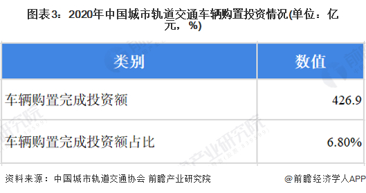 根据中国城市轨道交通协会的统计数据,2020年,我国城市轨道交通车辆购置投资金额为426.9亿元,投资额占比为6.8%。