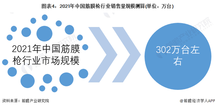 从职业运动员及健身人群的群体来看,该类群体对于筋膜枪的需求较为强烈,可用于运动前中后三个阶段,因此有较多职业运动员及健身人群购买筋膜枪;而对于普通人群而言,大部分是因为市场营销而进行购买,并不存在较强的购买动机,渗透率较低。结合以上因素及各类人群的人口数量,前瞻测算2021年中国筋膜枪行业销售量规模约为302万台。