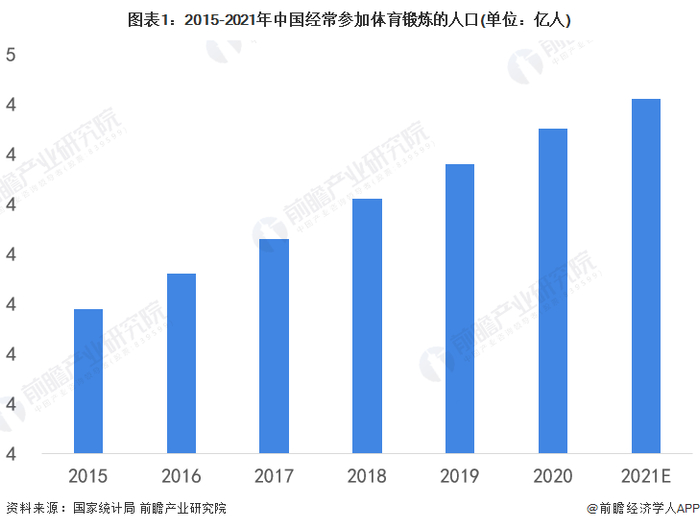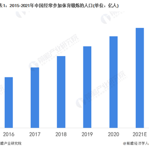 在我国政府提倡“全民运动”的背景下,参与锻炼人口不断增多。2015-2020年我国经常参加体育锻炼的人口呈上升趋势,截至2020年底,我国经常参加体育锻炼的人口已达4.35亿人,处于历史最高位,根据国家政策引导,未来我国参加体育锻炼的人口仍将继续增长。预计2021年将突破4.40亿人。
