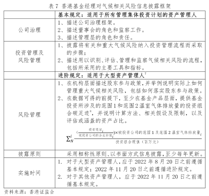 2021年8月20日,香港证监会以通函的形式发布《基金经理对气候相关风险的管理及披露》,正式要求在港经营资产管理机构管理并披露气候相关风险。该文件主要以TCFD的《气候相关财务披露工作组建议》为框架,结合现行的《基金经理操守准则》并听取行业意见后适当调整。文件主要涵盖四个方面:公司治理、投资管理、风险管理及信息披露,披露标准分为基本规定和进阶规定。该报告信息披露方面的规定值得借鉴。