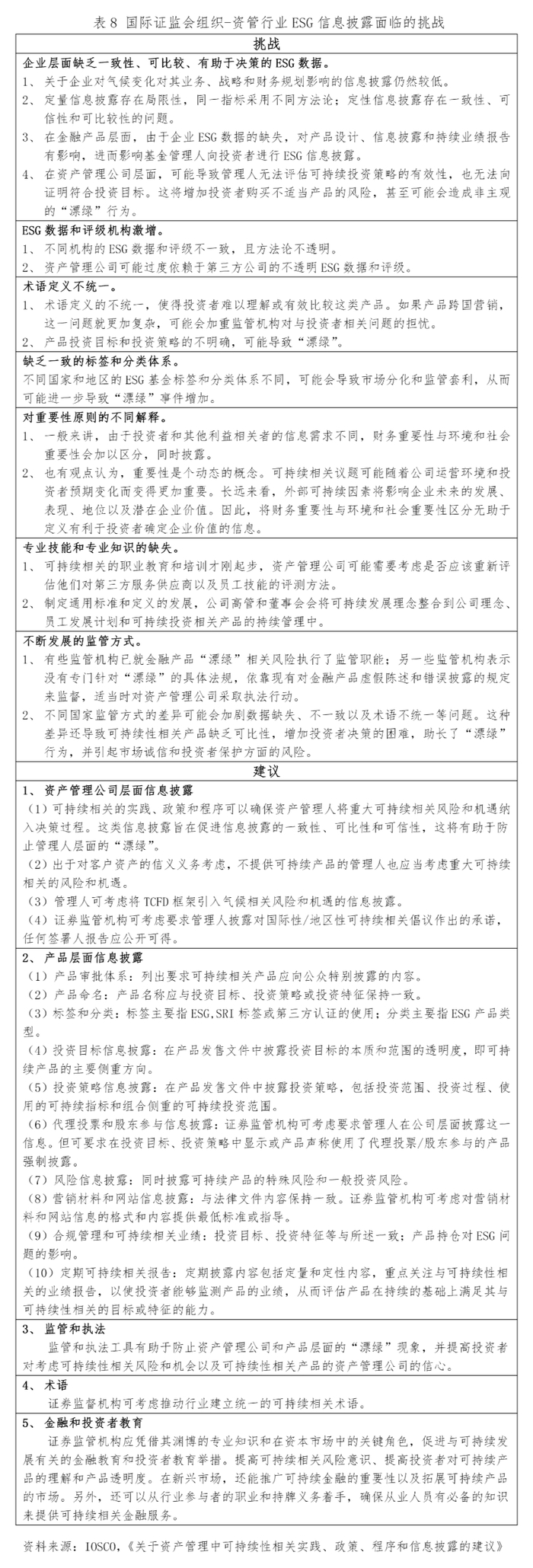 国际机构对资管行业的ESG信息披露也有诸多讨论,这在一定程度上也将促进ESG在资管行业的发展。在国际证监会组织(以下简称“IOSCO”)近期的一份报告中就当前资产管理行业ESG信息披露面临的挑战进行总结,并向证券监管机构和政策制定机构提出建议。