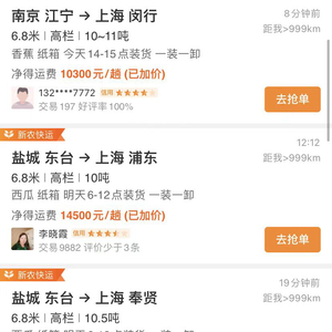 在货运匹配平台运满满上,东台、南京、扬州、连云港等地发往上海的货运订单,最高运价均超过了万元。其中有一单从东台运送18.5吨蔬菜到上海,运费已接近2万元。这些地方距离上海仅有两三百公里,而且果蔬车辆走高速绿色通道还不用缴纳通行费。
