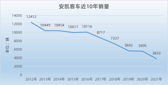 2021年,安凯客车实现销量3833台,较上年同期下降31.61%。