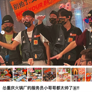在小红书、B站上关于怂火锅的评价里,除了排队时间长,网红感的火锅菜品外,大家最热衷讨论的是高颜值店员们的热舞。
