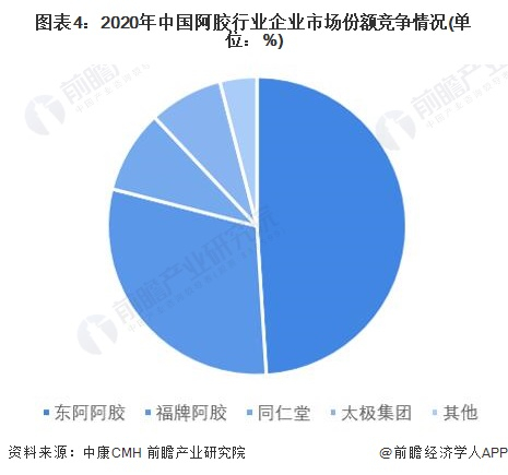 目前,中国主要的阿胶生产企业有东阿阿胶股份有限公司、山东福牌阿胶股份有限公司、山东宏济堂制药集团股份有限公司、山东鲁润阿胶药业有限公司、中国北京同仁堂(集团)有限责任公司、九芝堂股份有限公司、重庆太极实业(集团)股份有限公司、兰州佛慈制药股份有限公司等。其中东阿阿胶股份有限公司和山东福牌阿胶股份有限公司长期以来分别作为我国阿胶产品高端市场和中低端市场的代表企业,占据了我国大部分阿胶市场份额,前瞻结合中康CMH披露的阿胶产品销售额对阿胶行业企业竞争情况进行综合分析,2020年,东阿阿胶股份有限公司占我国阿胶行业市场份额的比重达49%,福牌阿胶占我国阿胶行业市场份额的比重为30%。我国的阿胶行业呈现双寡头竞争的格局。