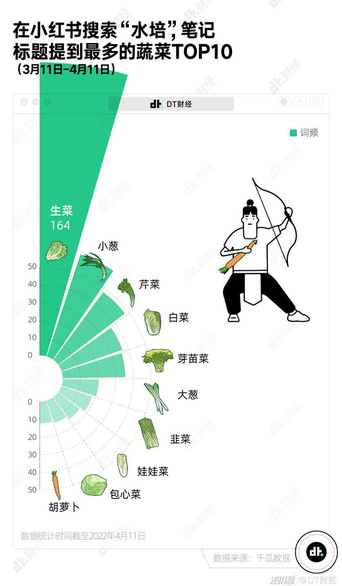 比如在小红书里,大家在笔记标题里提到的蔬菜大都是平时常吃的菜。出现次数最多的是生菜,其次是小葱、芹菜。