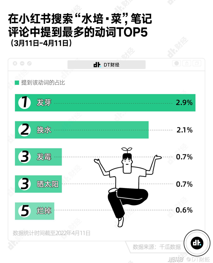 像浦浦一样的新手还有很多。从小红书“水培·菜”的笔记评论中出现最多的动词来看,大部分人水培蔬菜的困惑都是关于怎么让蔬菜更好地生长、以及怎么避免水培过程烂掉的情况。比如“洋葱发芽了可以吃吗?”“青菜多久换一次水呢”“有啥技巧吗?我培着培着就烂掉了”等等。