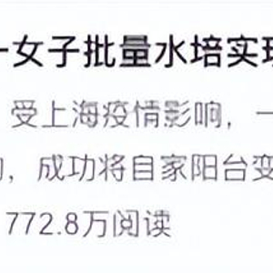 微博话题“上海一女子批量水培实现蔬菜自由”拥有接近800万的阅读量,小红书上周热门话题“水培蔬菜好快乐”的浏览量更是接近1200万。