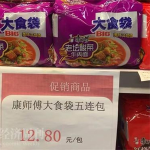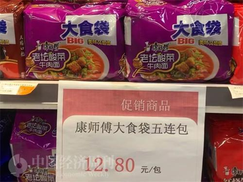 4月13日,记者来到北京市朝阳区某超市,看到康师傅老坛酸菜方便面被摆在货架显著位置,标签显示此款面的五连包售价为12.8元,系活动促销商品。
