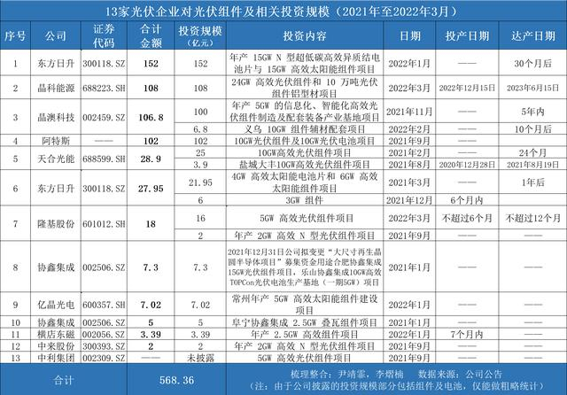 事实上,当前在光伏组件领域无论是五大巨头还是“六小豪门”多在斥巨资扩充产能。根据界面新闻不完全统计,自2021年以来,13家光伏公司宣布投资光伏组件的资金近570亿元,其中东方日升宣布所投金额最高,达152亿元,其次是晶科能源、晶澳科技和阿特斯,预计投资规模均超100亿元。