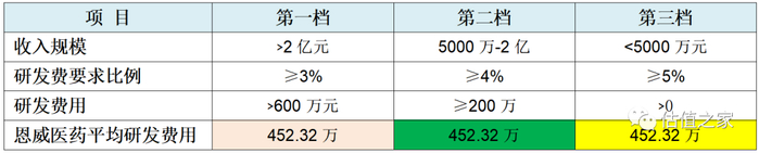 我们将恩威医药报告期内的研发费用(2021年为432.48万元、2020年为484.23万元以及2019年为440.26万元)依次对比上表研发费用栏,很容易看出其明显不符合第一档研发费用600万起步的标准。而符合第二档和第三档的标准,而第二档测算出的结果大于第三档的测算结果,所以我们以第二档4%的最低研发费用比例为最优测算结果,并以恩威医药的研发费用为基础,可以测算出报告期内恩威制药报告期内对应的最高收入分别仅为:2021年10,812万元、2020年12,105.75万元及2019年11,006.5万元。也就是说恩威制药上报给当地税务机关和当地科委的收入数不会超过这三个数字,否则高企资格不保。