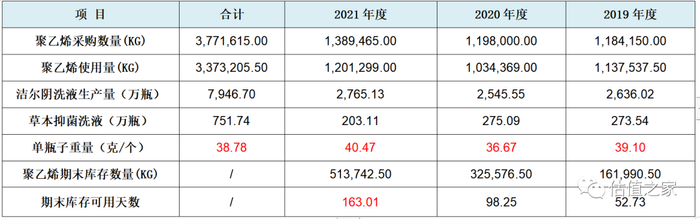 结合招股书披露的其他信息来看,恩威医药采购如此巨量的聚乙烯主要用途是用来生产洁尔阴洗液的包装瓶子,报告期内聚乙烯的采购领用产出数据见下表: