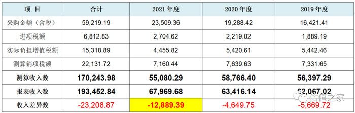 估值之家截取招股书采购总额和恩威医药主业所适用的增值税率13%为基础,以报告期间实际负担的增值税推算出其收入与报表收入数比较见下表: