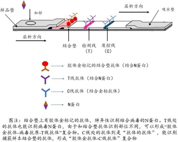 那么,一张试纸条,是怎么做到快速检测到新冠病毒n蛋白的呢?王道盛解释,检测抗原的技术被称作胶体金法。试纸在不同区段中,固定了3种不同的抗体,分别位于结合垫、检测线(t线)和质控线(c线)上,可以与不同成分特异性结合。