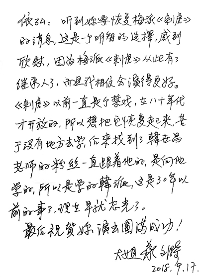 当年梅兰芳先生访美带去的昆曲《刺虎》,在2018年由史依弘恢复演出,听闻此消息,华文漪从美国发手写信给史依弘以鼓励,史依弘亦手写回复