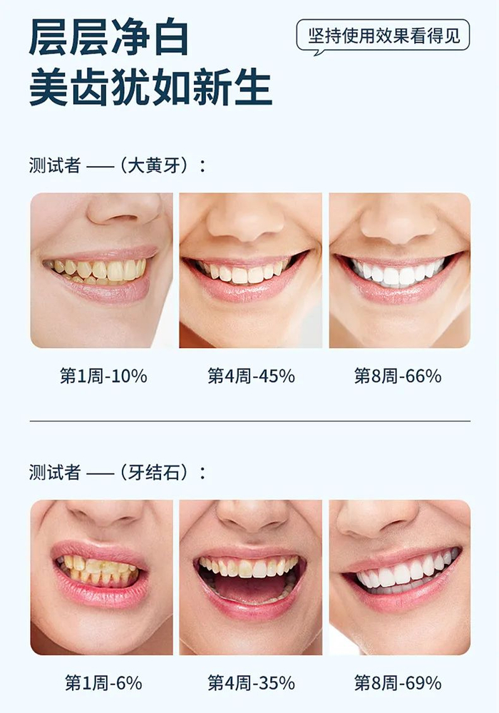 品牌方还找了志愿者进行多次实验,坚持使用一段时间,瞧瞧着牙齿的变化,太让人欣喜了。