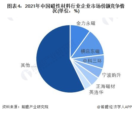 目前,中国主要的磁性材料生产企业有金力永磁、横店东磁、中科三环和宁波韵升等;其市场规模均在10%及以下。中国磁性材料行业由于细分产品众多、企业集中度相对较低,相比之下横店东磁作为全球磁性材料的龙头企业,其生产产品线众多,产能强劲;其他企业的市场份额均不超过10%。